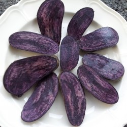 Zwarte aardappels vormen een onbekende groep in ons sortiment. De schil is dieppaars tot bijna zwart en het knolvlees is paars, gewolkt of wit. Om het verrassende effect van de kleur te behouden bevelen we aan om de knollen niet te schillen maar te wassen voor het koken. Planten vanaf half april, als de grond voldoende warmte heeft. Voorkiemen in het licht of in een grote pot mag eerder. Zet ze niet op een te natte plek, wel goed in de zon. De gemiddelde plantafstand is 70x40 cm, wij adviseren om 80x40 cm aan te houden om ziektes te voorkomen.