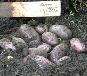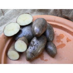 ECO GETEELDE AARDAPPELS. "Zwarte muisjes" noemen we dit Hongaarse ras, ze zijn donkerviolet van schil en wit van knolvlees en (voor een zwartschillige) tamelijk vast van structuur. De mooie ovalen muisvorm met weinig diepe ogen maken het ras aantrekkelijk om ongeschild te koken. Ze geven een grote oogst na de sierlijke lilawitte bloei.