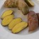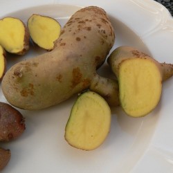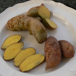 2) Druppelvormig met oranje-geel gebloste schil en korte kiemrust, het knolvlees is opvallend donkergeel. Na de kook (snel gaar!) blijkt een zalvend mondgevoel en een goede, complexe smaak.