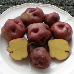 Waarschijnlijk een oeroud Peruaans rasje met een onaangepast uiterlijk: zeer diepe ogen, blokkerig van vorm en met dieprode schil. Echt een aardappeltje om in de schil te koken dus, wat ik overigens altijd al doe... Het knolvlees is lichtgeel van kleur en bij het doorsnijden blijkt de stevigheid van de harde knollen. Na koken blijkt dit ras toch iets kruimig met een duidelijke, prettige smaak.