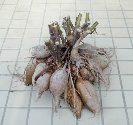 De planten worden gerooid zodra het blad teruggaat in levenskracht. Dat gebeurt meestal laat in de herfst door kou. De knol ziet er uit als een Dahliaknol, waarbij de functie van het stengeldeel dus essentieel is. Er kunnen veel zijknollen worden geoogst, enkele zijknollen met het stengeldeel in zand of opgepot overwinteren op een vorstvrij plaats. Tijdens de groei in de zomer kunnen stekken worden gesneden, zodat er ook jonge planten kunnen overwinteren, zo gaat de vermeerdering veel sneller.