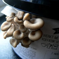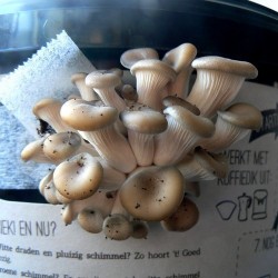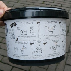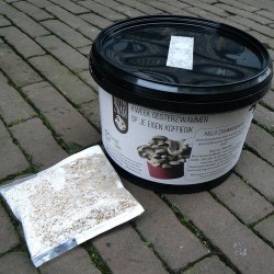 Kweek Oesterzwammen op je eigen koffiedik! De basis: 1) een duidelijke uitleg, 2) het broed van de Grijze- of Winteroesterzwam en 3) een zwart emmertje van gerecycled kunststof. Voeg daaraan je koffiedik (of koffiedroes) toe in fases volgens de aanwijzingen en ziedaar: heerlijke verse oesterzwammen! Afmeting emmer 20 cm (doorsnee boven), 17 cm (doorsnee onder) en 14 cm hoog.