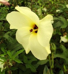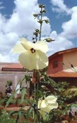 204000) heeft zo'n uitgesproken sierwaarde dat we ze (ondanks veel eetbare delen) toch maar bij de sierplanten indelen. De stevige plantopbouw begint met grote, handvormige bladeren, de hoogte varieert van 80-150cm (afhankelijk van weer, grondsoort en bemesting). De bloemen zijn zeer groot, schotelvormig, creme tot citroengeel van kleur met een dieppurperen hart. Wortels, bloemen, bladeren en vruchten zijn eetbaar. Tip: voeg eens enkele gesneden blaadjes toe aan een boerenomelet: heerlijk!
