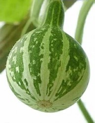Kan gewoon buiten groeien. Plant met kruipende ranken met daaraan siervruchten, die de gehele winter menige fruitschaal sieren. Een zeldzaam mini-kalebasje in de vorm van een peertje: groen gestreept. Als 515430, maar dan in ‘t klein; slechts 4-5 cm groot.