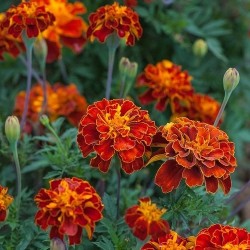 Deze afrikaantjes zijn extra regenbestendig en bloeien dus bij regen en zon een heel seizoen door! Voor een patula-variëteit is dit een tamelijk grootbloemig ras in een diepe tint: mahonie met oranje randjes. De planten groeien robuust tot een hoogte van 30-40 cm.