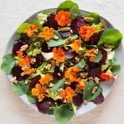 Niet rankende plant met gespoorde bloemen in alle vrolijke en warme tinten. Enkelbloemig en compact: 30-40 cm hoog. Alle delen van de Oost Indische Kers zijn eetbaar, de bloemetjes en blaadjes zijn prettig pittig, in de zomer met een lichte nabranding.