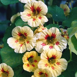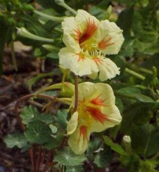 De halfdubbele bloemen zijn crème met oranje vlekken in de keel. Deze steken prachtig af tegen het donkergroene blad. De niet rankende, compacte planten (hoogte 30 cm) geven de gespoorde bloemen boven het blad.