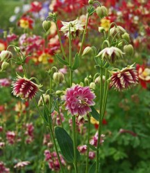 Typerend voor de bloemvorm zijn de kroonbladeren met korte of lange sporen en de enkele of dubbele kelkbladeren. Een speels dubbelbloemig akeleitje met spits bloemblad. Dit vrolijke mengsel bevat de kleuren: roze, wit, blauw en wijnrood. Het leuke van dit ras zijn de witte of groene puntjes die regelmatig het bloemblad sieren. Hoogte 75-100 cm.
