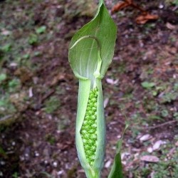 Op 80 cm hoogte groeien boven de fraaie, de handvormige bladeren de groen (meestal wit gestreepte) bloemschedes met een fraai bruin staartje aan de bloeikolf. Na de bloei ontstaan fraaie trossen met rode bessen, die het zaad bevatten. Dit soort is goed winterhard en zaait zich gemakkelijk uit.