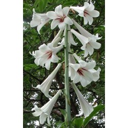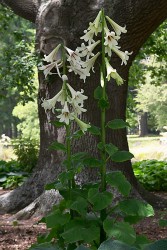 Een bijzondere en spectaculaire telg van de lelie-familie uit China en Japan. De plant laat de eerste jaren “alleen” een mooie, hosta of aronskelk achtige plant zien. De variëteit yunnanensis wordt wel gezien als de absolute “King” van deze soort, vanwege het diepgroene blad (purperbrons in aanleg) en de dieprode nerven en stengel. Na enkele jaren geeft de plant op 1,5-2,5m hoogte een uitbarsting van iets naar beneden gerichte, grote trompetvormige bloem: wit met een prachtige wijnrode keel. Bescherm de plant goed ‘s winters of bewaar de bollen vorstvrij. Enkele uren zon per dag is de beste omstandigheid, te veel zon geeft bladverbranding. Onze foto’s laten meestal de gewone C. giganteum zien!