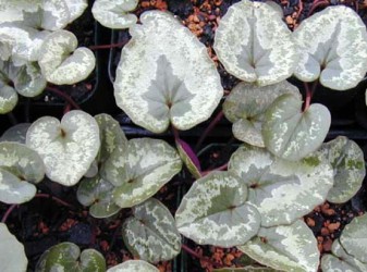 HERFSTBLOEIEND. Deze winterharde cyclaam houdt van halfschaduw en niet te vochtig. Deze kleine soort heeft ronde of hartvormige bladeren met lichtgroene of zilvergrijze vlekken. De roze bloemen hebben onderaan een paarsrode vlek en bloeien van september-oktober.