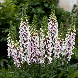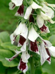 Een bijzondere vingerhoedskruid! De roomwitte bloemen hebben een diepwijnrood centrum, dat extra zichtbaar is, omdat de (normaal buisvormige) bloemen met een “split” zijn opengewerkt. Het geeft een luchtig en verrassend effect! Hoogte 120-140 cm, 3-5 bloemstengels per plant. Bij zeer vroege zaai (januari-maart) is er kans op bloei hetzelfde jaar.
