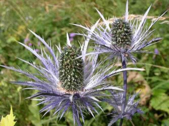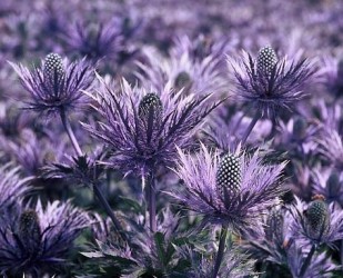 Alpendistel is een grote staalblauwe distel, die niet prikt. Prachtig in combinatie met zachtroze of gele bloemen. Sterke snij- en droogbloem Hoogte 80 cm