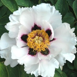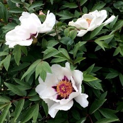 De 1,2 m hoge, struikvormige pioenrozen met enorme, prachtige bloemen! De bloemen kunnen wel 25 cm in doorsnee worden, de witte kelkbladeren zijn in 2 etages gerangschikt (10 kroonbladeren en 7 kelkbladeren) naar het centrum toe hebben de kelkbladeren een decoratieve, zeer donkerpaarse vlek. De meeldraden en stamper zijn ook erg sierlijk! Deze soort komt voornamelijk voor in midden China.
