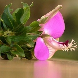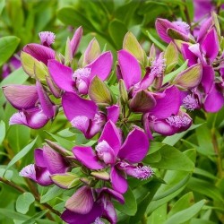Een vrolijk bloeiertje in opkomst! Met “dank” aan de zachtere winters, blijft deze plant steeds gemakkelijker overwinteren, bij strenge vorst wat extra beschermen is wel aan te bevelen. De plant start met kleine, myrte-achtige blaadjes en geeft na enige tijd groei, aan de jonge scheuten: vrolijke, bijzonder gevormde bloemetjes met 2 langere bloemblaadjes aan de zijkanten, waardoor het lijkt of ze vleugeltjes hebben! Dit alles in een helder, lilaroze kleur.