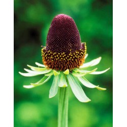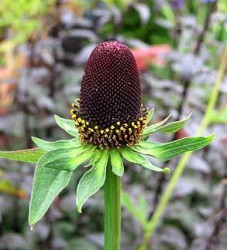 Het lijkt wel of de “bloemen” van deze forse plant (120-140 cm) de “bloembladeren” hebben verloren. Waar normale bloemen gekleurd bloemblad heeft, zien we een krans groene, smalle kelkbladeren. Ze steken af tegen het dikke, donkerpurperen (bijna zwarte) bloemhart: een mysterieuze bloeiwijze,