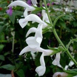Er zijn veel Salvia’s, maar de patens is van extra schoonheid. De bloemtros is ijl en de lipbloemen groot met lange lippen. De kleur is van het helderste wit! Een frisse harmonie met het lichtgroen van de behaarde stengels en bladeren… De hoogte is 75-90 cm, bewaar de planten op een vorstvrije plaats; een strenge winter is funest.