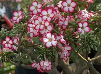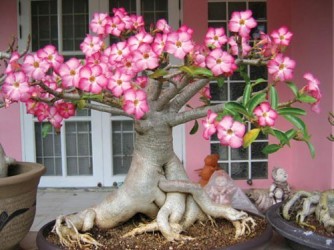 Dat deze decoratieve plant een familielid is van onze Vinca (maagdenpalm) kan je wel zien aan de bloem en het glimmende blad, maar niet aan de dikke, vlezige stam, die vanuit zich verdikkende wortels wel een hoogte van 1 meter kan bereiken (in de natuur wel 3 meter!) De planten bloeien rijk aan de toppen en vernieuwen regelmatig de naar breed uitlopende bladeren. De zaden van deze meeste bekende (maar daarom niet minder fraaie) soort komt van planten in Tanzania. De bloemen zijn helder wit met een rood randje. Geef de plant een warme en licht plek, te veel water is uit den boze. Bonsailiefhebbers zijn gek op deze plant, omdat eigenlijk vanzelf een miniboompje wordt gevormd.