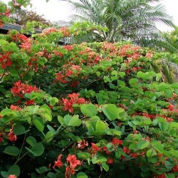 310950. Een subtropisch bloemenwonder, een plekje in de vensterbank is uitstekend! In de zomer mag de plant op een beschut plekje buiten, een nachtvorst is geen probleem. De beloning is de jaar na jaar meer trossen steenrode kelkbloemen met 5 bloemblaadjes die met een dunne aanhechting wel lijken te zweven... De planten hebben enige steun nodig, in de natuur klimmen ze in andere struiken en bomen. Het hartvormige blad geeft een romantisch tintje… De bloemen, bladeren en vruchten van de plant zijn eetbaar!