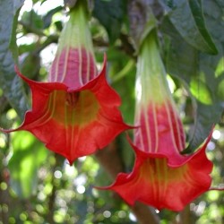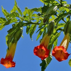 Een prachtige en grote plant met een overvloed van 30 cm lange, hangende trompetbloemen. De hals is warmgeel en vloeit naar de trompet over naar scharlakenrood. Bij deze fantastische kleur moet je helaas wel de geur inleveren... Zet de planten in een flinke pot, goed drainerend, geef ze veel water en vooral veel bemesting. Binnen 1 jaar kunnen ze bloeien en eenmaal aan de groei kan je ook volop van de planten stekken. Met wat bescherming kan de plant de meeste winters goed overleven. Let vooral in het begin wel op slakken, die lusten er wel pap van!