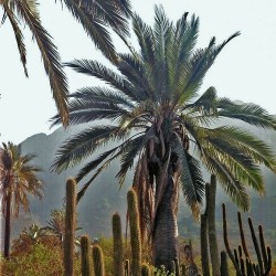 De meest winterharde vederpalm! Deze Chileense palm wordt aldaar wel tot 25m hoog en heeft dan een stamdoorsnee van 2m! De grootste palm ter wereld. Bij ons een succesvolle potplant (mag in de zon) en blijft dan bescheiden in afmeting, omdat de groei langzaam is. Op een beschutte plek goed buiten te overwinteren. Van het stamsap wordt wijn gemaakt, vandaar de naam. Ontkieming bij 30°C!