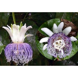MOMENTEEL UITVERKOCHT. Aparte, grote bloemen met achterover geslagen wit bloemblad en komvormige naar voren gerichte corona met sliertjes in dieppaarse kleur. Dit tropische soort vormt eetbare, oranje vruchten. Decoratief is ook het tweezijdig glanzende blad. Kieming is langzaam en onregelmatig.