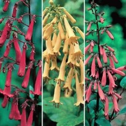 In de late zomer bloeien de 100-150cm hoge planten met trossen hangende buisbloemetjes en hebben iets van een fuchsia weg. Dit mengsel geeft rode, gele en zalmkleurige bloei. Bij goede blad-bedekking blijft de plant goed over-winteren. Geef ze een zonnige plek. ZaaimethodeZaaien: het gehele jaar op een warm plekje. Na opkomst licht en koel zetten en verspenen in potjes. Leveringsmaandenhet gehele jaar