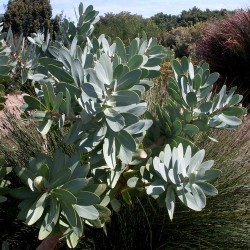 Even een algemene verkenning van deze importzaden. Deze plant met zijn fluweelachtige bloem (suikerbossie) is typerend voor Z-O Afrika en de Kaap. De teelt is gemakkelijk, u krijgt op verzoek een uitgebreide zaai- en teeltbeschrijving en natuurlijk: bij ons is het een kuipplant, dus 's winters koel overwinteren. Dit is de enige Protea, die in Zuid-Afrika uit kan groeien tot een flinke boom, de rest blijven struiken. Wij kweken deze (uiteindelijk) in een flinke pot, waar de plant door snoeien compact gehouden wordt. Het oudere, lancetvormige blad krijgt een blauwe glans, vandaar de Afrikaanse naam. De witte tot zeer lichtgele bloemen zijn breed en van opvallende schoonheid!