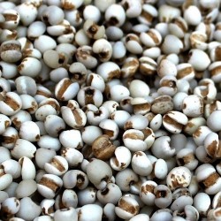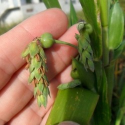 Grassoort uit Indonesië met breed lancetvormig blad. De plant is winterhard tot Zone 9, d.w.z. een lichte nachtvoorst wordt verdragen. De bijzondere bloeiwijze komt uit de oksels: een rond bolvormig vruchtje, wit en hard als een parel, gevolgd door een kort pluimpje. Na drogen (eerst op het veld laten rijpen) ligt het voor de hand, dat de zaden als kralen worden gebruikt. Zeker zo bekend zijn de consumptiekwaliteiten van Jobstranen: de zaden worden gekookt en zijn dan door de milde, prettige smaak een goede aanvulling in soepen, bij een grote oogst is het een goede tarwe- of rijstvervanger. Van geroosterde zaden maak je een redelijke surrogaat-koffie en de zaden laten zich ook fermenteren tot bier of wijn. Het hoge proteïnegehalte is vrij bijzonder. Hoogte 60-80 cm.