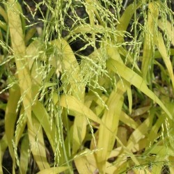 Het eerste wat opvalt aan dit prachtige siergras zijn de brede zwierige bladeren. Daarnaast valt uiteraard het oplichtende, geelgroene blad op. De ijle bloei maakt het plaatje compleet. Tenslotte is bijzonder, dat dit siergras zelfs prima in de schaduw groeit. Hoogte 70 cm.