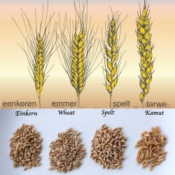 Emmertarwe, de oervader van harde tarwe (Triticum durum) en khorasantarwe (Triticum turgidum), is historisch gezien de belangrijkste tarwesoort. Bij vele opgravingen in het Midden-Oosten en in Europa zijn resten van deze tarwesoort gevonden. De gedomesticeerde emmertarwe werd al vanaf 7000 v.Chr. verbouwd in onder meer Egypte. Ook is het een van de planten die ruwweg zo’n 2000-3000 jaar geleden in Nederland werden verbouwd op de zogenaamde raatakkers, ook wel bekend als ‘celtic fields’. Voor de Tweede Wereldoorlog werd emmertarwe nog verbouwd in Duitsland, in Thüringen en Zuid-Duitsland. In Noord-Beieren, in de omgeving van Coburg, wordt weer emmertarwe verbouwd. Onder andere voor de bereiding van emmerbier. Ook in Nederland komen proefprojecten met emmertarwe voor, zoals in de Haarlemmermeer. Op grotere schaal wordt het alleen nog geteeld in Ethiopië, Turkije en Syrië, waar de soort ook in het wild voorkomt. Emmertarwe kan 2 meter hoog worden. De oortjes zijn groot en gewimperd. Het tongetje is middelgroot en stompgetand. Het aartje heeft aan het onderste kroonkafje een enkele centimeters lange kafnaald en twee bloempjes. De korrels worden strak door de kafjes omsloten, daarom moet emmertarwe voor het vrijmaken van de korrels gepeld worden. Emmertarwe legert gemakkelijk. De oogst vindt plaats in augustus. De graanvrucht is vrij klein en de opbrengst per hectare laag, maximaal 2.500 kg per hectare. Vanwege het lage glutengehalte is emmertarwe alleen geschikt voor de broodbereiding met koud rijzen en zuurdesem. Het brood is licht nootachtig van smaak en vochtig. Deze tarwesoort kan ook als smaakstof voor volkorenbrood worden gebruikt. (bron o.a. Wikipedia) ZaaimethodeZaaien: sept-okt of mrt-mei, dun uitstrooien, inharken en aandrukken. Liefst met een dunne laag grond bedekken. Op rijen zaaien kan ook, 2-3 cm diep is voldoende. Leveringsmaandenhet gehele jaar