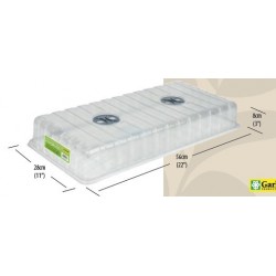 Een halfhoge, voordelige transparante kap. De kap heeft 2 ventilatie-openers en is wel zo gevormd, dat veel condens langs de randen wegglijdt. Afm. (lxbxh): 56x28x8 cm. Deze kap is speciaal gemaakt dat hij past op onze microgroente schotels. (G213 en G222).