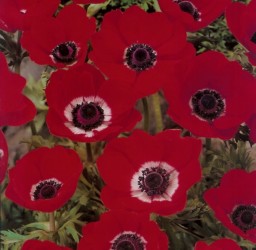 Verreweg de bekendste anemoon, geliefd door alle tijden heen als snijbloem en al vanaf ca. 1850 vanuit Frankrijk in ons land geïntroduceerd. Er zijn twee bekende typen: het De Caentype met grote, fraai gekleurde, enkelvoudige bloemen en het St. Brigidtype met halfgevulde bloemen en vrij smalle bloemblaadjes. Verlangen voedzame humeuze grond en met enig winterdek voldoende vorstbestendig. Hoogte 25 cm. Prachtig scharlakenrood met witte rand rond het zwarte hart, enkelbloemig.