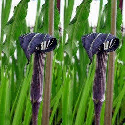 Een geheel winterharde, opvallende tuinplant met een exotische uitstraling. Eerst groeien de frisgroene, bladeren aan lange stengels. Het blad is vanuit het centrum verdeelt in (meestal) 10 delen en vormt zich als een parasol rondom de stengel. Alleen hiervoor al verdient de plant een plekje in je tuin! Als vervolgens de ranke, bekervormige bloemen ontstaan (hoogte 40-60 cm), dan is het genot compleet: ze zijn groen-wit met zwartpurperen strepen in de lengterichting. Het achterste deel van het schutblad (bloeischede) heeft een overbuigende, lange uitgroeiing waardoor een dakje ontstaat. Het beeld van een ouderwetse preekstoel is compleet! De planten groeien en bloeien waar andere planten het laten afweten, namelijk in de schaduw. Geef ze een plekje met veel humus.