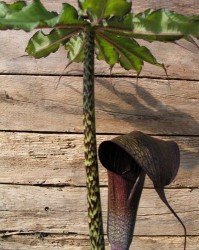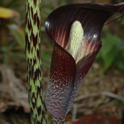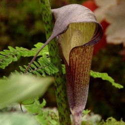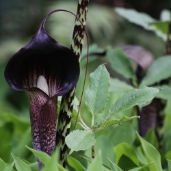 Deze zeldzame, maar wonderschone Arisaema is een opvallende sieraad voor je tuin, maar groeit ook zeer goed in potten! In het voorjaar sprinten de planten uit de grond tot 70 cm hoogte, de dikke stengels zijngroen met zwarte vlekken en de vingervormige bladeren ontvouwen zich als een parasol, net een fraai palmboompje... Al snel volgende de bruinpaars gestreepte aronskelkbloemen met overhangend deksel waar een lange punt aan groeit. De knollen zijn prima winterhard, plant ze niet te ondiep: 20 cm, in humusrijke grond op een halfschaduw plekje.