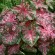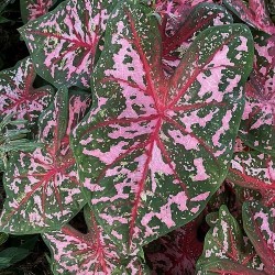 De grote pijlvormige bladeren zijn lichtroze met rozerode nerven en een brede, groene omranding.