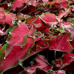 De grote pijlvormige bladeren zijn fraai gegolfd van vorm. Het dieprode centrum heeft een even diepgroene omranding.