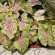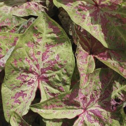 De grote pijlvormige bladeren zijn bijzonder zacht van tint: zeer lichtgroen met licht lilaroze spikkels of vlekken in het centrum.