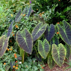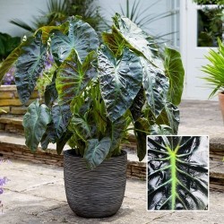 Fantastische bladerpracht! De plant groeit iets bescheidener dan de meeste Taro’s dus passen goed op een kleinere plek. De knol overleeft vele winters, een beetje extra dek helpt daarbij, en elk jaar loopt de plant uit tot een volle en exotische schoonheid. Vaak ontstaan op het blad donkerte vlekken, waardoor de groene nerven sierlijk oplichten!