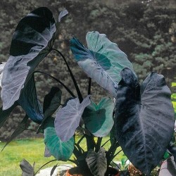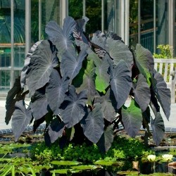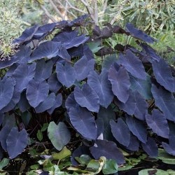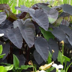 Een prachtige bladplant met enorme purperbruine bladeren (de vorm als olifantsoren) en met nog donkerder nerven en stengels. Tot bloei komt deze aronskelkachtige niet in ons klimaat. Zet ze vochtig tot nat en 's winters vorstvrij en droog (hoewel extra dek over de knollen vaak voor overleving in onze winters zorgt). De Taroknollen worden al sinds mensenheugenis in de tropen gegeten, in Azië en Afrika is de teelt enorm populair, ze bevatten 25% zetmeel en zijn vrijwel ongevoelig voor ziekten. Ze worden gekookt, geroosterd, gebakken en gefrituurd. In Afrika worden ze in een pasta (“fufu”) verwerkt. Het blad is na koken ook eetbaar (lekker om vlees of vis in te rollen). Hoogte 1m.