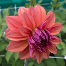 Een zgn. Decoratiefbloemig Type, d.w.z. met brede lintbloemen. De koraalroze tot abrikooskleurige brede bloembladen zijn lilakleurig in het centrum en aan de achterzijde van het bloemblad. Een fantastisch kleurenwonder! Hoogte 90 cm, het blad is donkergroen.