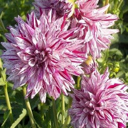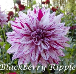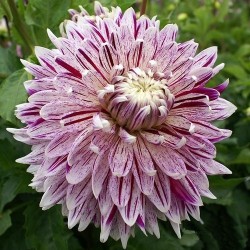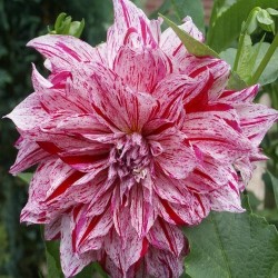 Een zgn. Decoratiefbloemig Type, d.w.z. met brede lintbloemen. Hoe beschrijf je zo'n beauty? Een witte, vrij puntige bloem (voor een decortatief type) met donker-wijnrode strepen in willekeurige dikte, vanuit het centrum naar buiten. Dat resulteert in de meest fantastische "splish-splash"-vlekken! Hoogte 110 cm.