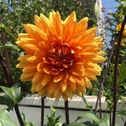 De koning van de zomerbloeiende knollen! De grote verscheidenheid aan kleur en vorm, de adembenemende volmaakte vorm en de goede houdbaarheid op de vaas maakt deze bloem zo populair! Een zgn. Decoratiefbloemig Type, d.w.z. met brede lintbloemen. Lichtoranje met brede lintbloemen. Hoogte 110 cm.
