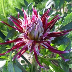 Een zgn. Cactusbloemig Type, d.w.z. met smalle tot zeer smalle, puntige lintbloemen. Deze variƫteit heeft wel hele smalle lintbloemen, die ook nog eens speels gekruld zijn! De gelijkenis met een spin dringt zich uiteraard op... De kleur is dieprood tot donker wijnrood met wit.