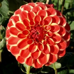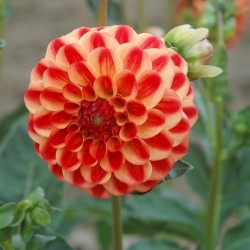 De koning van de zomerbloeiende knollen! De grote verscheidenheid aan kleur en vorm, de adembenemende volmaakte vorm en de goede houdbaarheid op de vaas maakt deze bloem zo populair! Pomponbloemige dahlia's geven een overvloed van wat kleinere, bolronde bloemen, samengesteld uit strak gerangschikte, brede lintbloemen. Hoogte 90 cm. Rood met een speels lichtgeel randje.