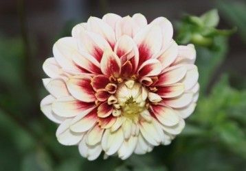 De koning van de zomerbloeiende knollen! De grote verscheidenheid aan kleur en vorm, de adembenemende volmaakte vorm en de goede houdbaarheid op de vaas maakt deze bloem zo populair! BIOLOGISCH GETEELD! Anemoonbloemige dahlia's hebben een gevuld centrum van fijne lintbloemen met er omheen een krans van bredere lintbloemen. Hoogte 60 cm. Wit met dieprood centrum. Sommige bloemen hebben de vorm van een zgn. "decoratief" type.