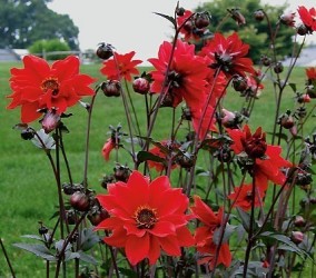 De koning van de zomerbloeiende knollen! De grote verscheidenheid aan kleur en vorm, de adembenemende volmaakte vorm en de goede houdbaarheid op de vaas maakt deze bloem zo populair! Classic dahlia's luiden de comeback in van ouderwetse en historische, donkerbladige dahlia’s. De bloemvorm is enkel of halfdubbel met zichtbaar hart. Hoogte 100 cm. Helderrood, halfdubbelbloemig.