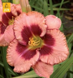 Roze met een purperkleurige binnenring en buitenomranding en uiteraard met de typerende gele keel.