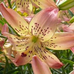 De lelie spreekt al eeuwen tot de verbeelding van de mensheid: in de bijbel als symbool van de schoonheid, in de Middeleeuwen als symbool van maagdelijke reinheid. De bloem geeft op een halfschaduwplaats in uw tuin een effect van verstilde schoonheid .… Aziatische Lelie, 90 cm hoog met aan elke bloemstengel een tros bloemen met brede, bloembladen. Lilaroze met naar het centrum toe dieppurperen streepjes en stippels.