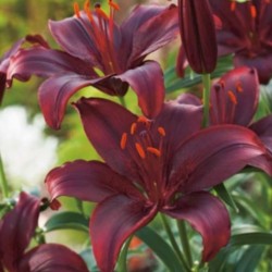 De lelie spreekt al eeuwen tot de verbeelding van de mensheid: in de bijbel als symbool van de schoonheid, in de Middeleeuwen als symbool van maagdelijke reinheid. De bloem geeft op een halfschaduwplaats in uw tuin een effect van verstilde schoonheid .… Aziatische Lelie, 80 cm hoog met aan elke bloemstengel een tros bloemen met vrij slank, spits bloemblad. De donkerste lelie uit ons sortiment: diep bruinrood.